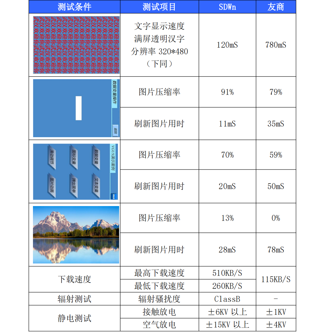 設計利用CPU并行機制讓讀寫flash數據和刷新屏幕數據同時進行,極大的提高了顯示速度,讓刷屏痕跡的現象一去不復返。對于以簡單純色為主的圖片,3.5寸屏刷屏時間僅需要10mS。而目前市場上類似方案的串口屏,3.5寸屏刷屏時間普遍都在50-100mS左右。