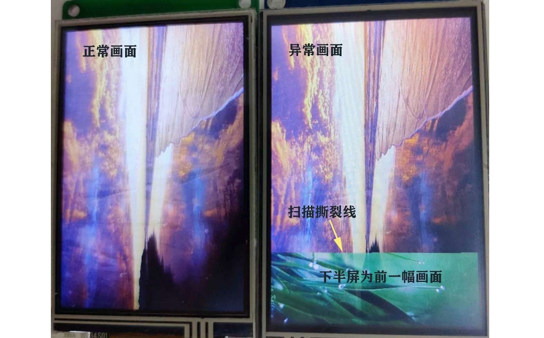 如果CPU刷屏速度不夠快,在切換畫面過程中,人眼會明顯看到畫面由上到下的變化,會在畫面上同時呈現前后兩幅畫面,在兩幅畫面交接的地方就會看到畫面被撕裂一樣的線條。由于3.5寸等小尺寸屏幕的像素顆粒大,使得畫面撕裂線非常明顯。目前市場上的3.5寸及以下串口屏,普遍都存在這種現象,特別是3.5寸320*480分辨率的串口屏最為嚴重。