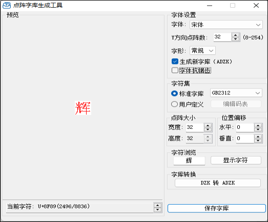 該案例中用戶使用字庫為宋體、32點陣、GB2312編碼,根據上述參數,勾選“生成新字庫ADZK”,生成了新的帶壓縮的ADZK字庫,字庫大小為2M字節。